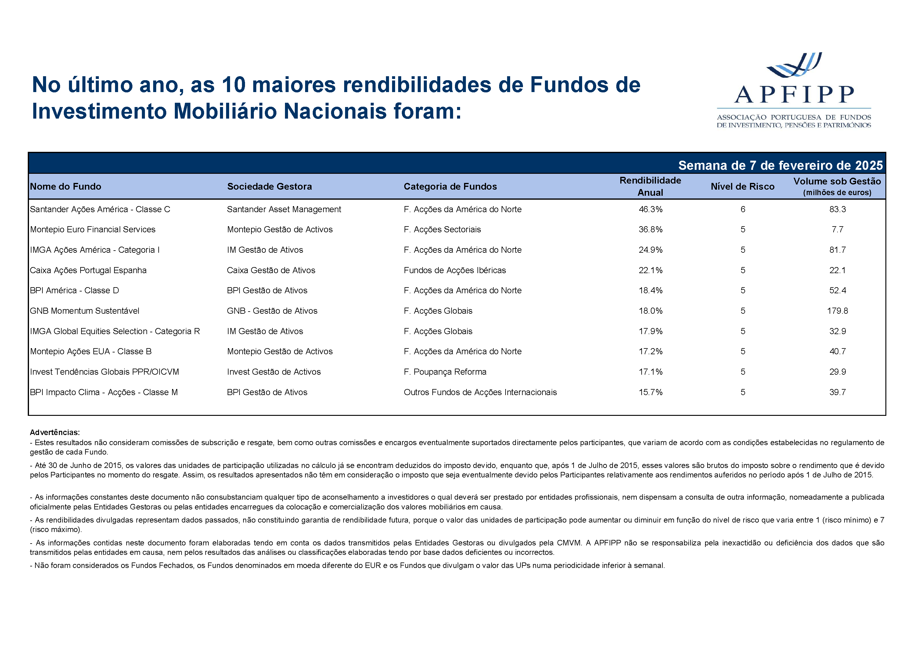 Maiores 10 Rendibilidades APFIPP (Semana 07 02 2025)